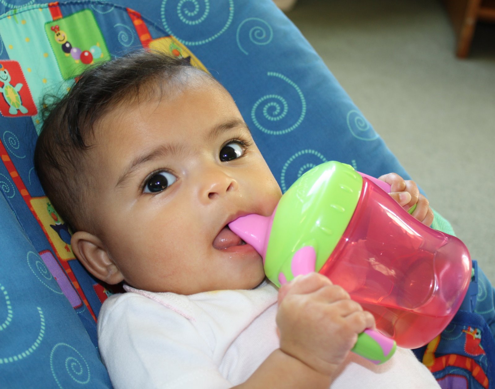 Wow that seems good for the sippy cup...I seem to remember "9 months" being the age. She is ahead of her time!